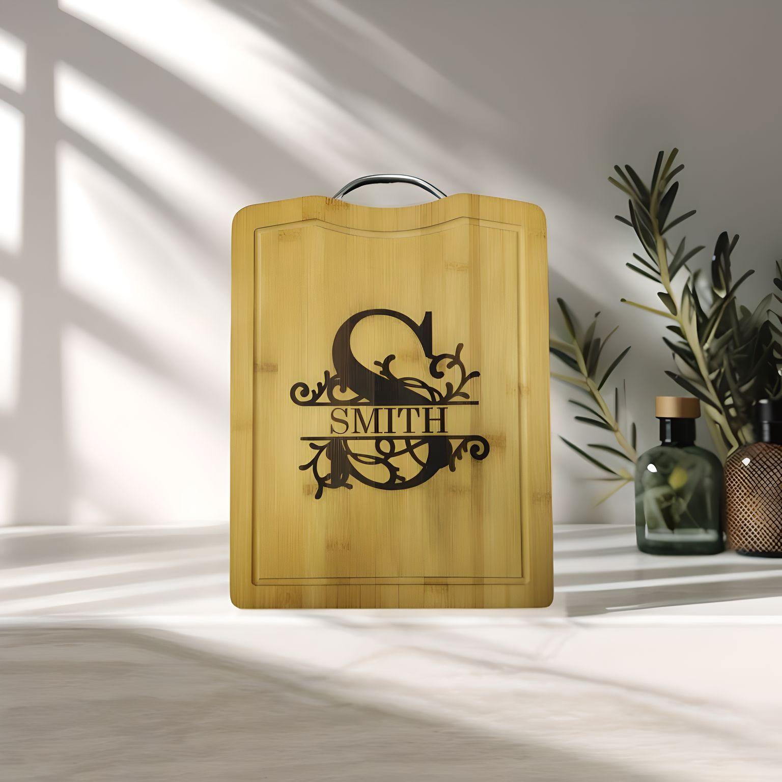 Design your board with a monogram (like the one shown) or any logo. Please keep in mind that bamboo is a very hard wood with many grain lines. Engraving may be darker or lighter in some areas that are beyond our control.