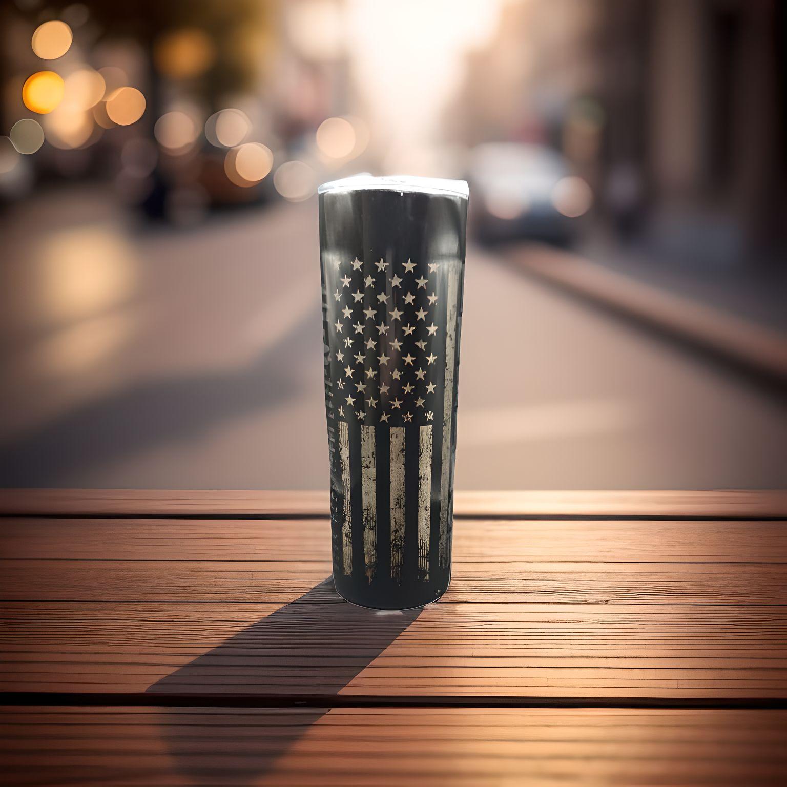 Show off your patriotism with this tumbler! These skinny tumblers are meticulously laser engraved with the American Flag, an eagle, the word FREEDOM, and other patriotic images. This tumbler makes a great gift for any occasion, even if it's just shopping therapy!