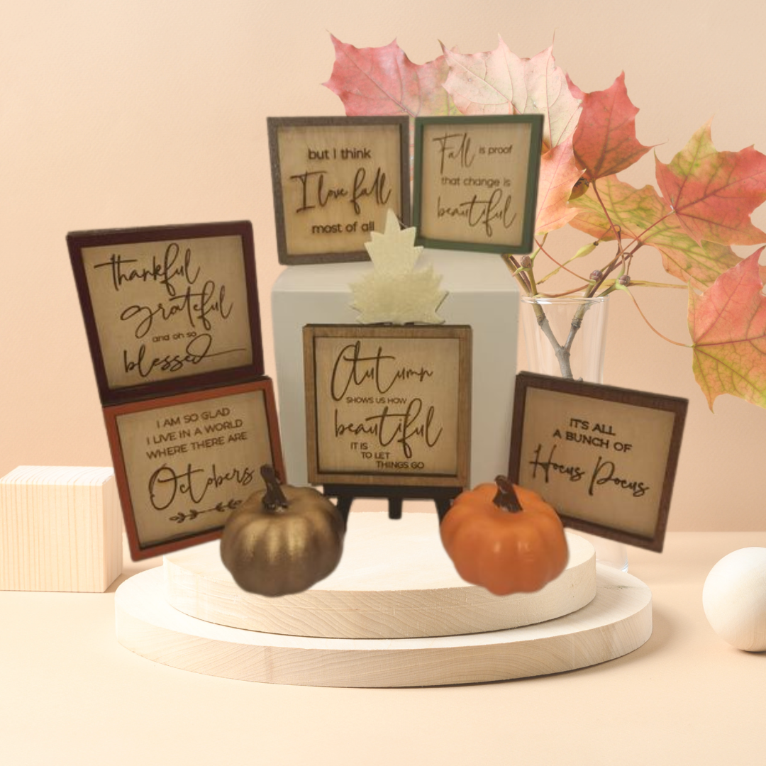 These mini fall signs are so cute and will add the perfect touch of charm to your fall decor. Each one has a different saying to capture the full feel of fall (1. I think I love Fall Most of all, 2. I am so glad I live in a world where there are Octobers, 3. Thankful Grateful and oh so Blessed, 4. Fall is proof that change is Beautiful, 5. Autumn shows us how Beautiful it is to let things go, & 6. It's all a bunch of Hocus Pocus).