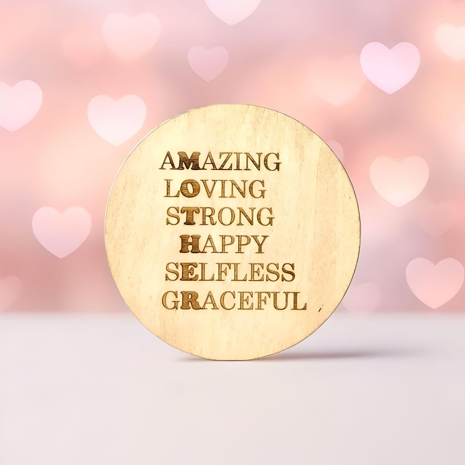 Each coaster comes with a different saying: (1) Motherhood: Powered by love, Fueled by coffee, Sustained by wine; (2) It's Not Easy Being A Mother. If It Were Easy, Fathers Would Do It; (3) Mother (muhth-er) = noun 1. One person who does the work of twenty For Free. (See also: 'masochist', 'loony', 'saint'; (4) World's Most Awesome Mom; (5) Amazing, Loving, Strong, Happy, Selfless, Gracefule; (6) Best Mom Ever.