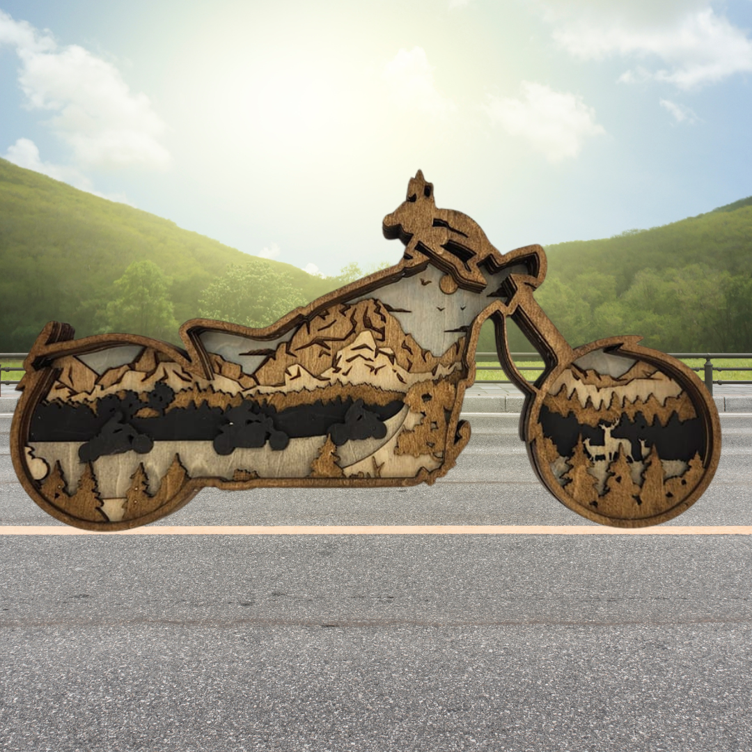 This beautiful wood multilayer motorcycle with an outdoor scene makes a unique addition to any motorcycle lovers home decor. Give this as a gift or add it to your decor! The freestanding design makes for easy display on a mantel, shelf, or any flat surface!